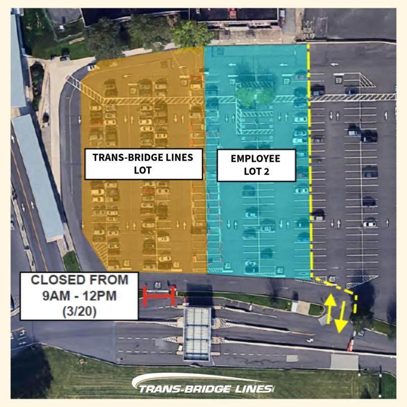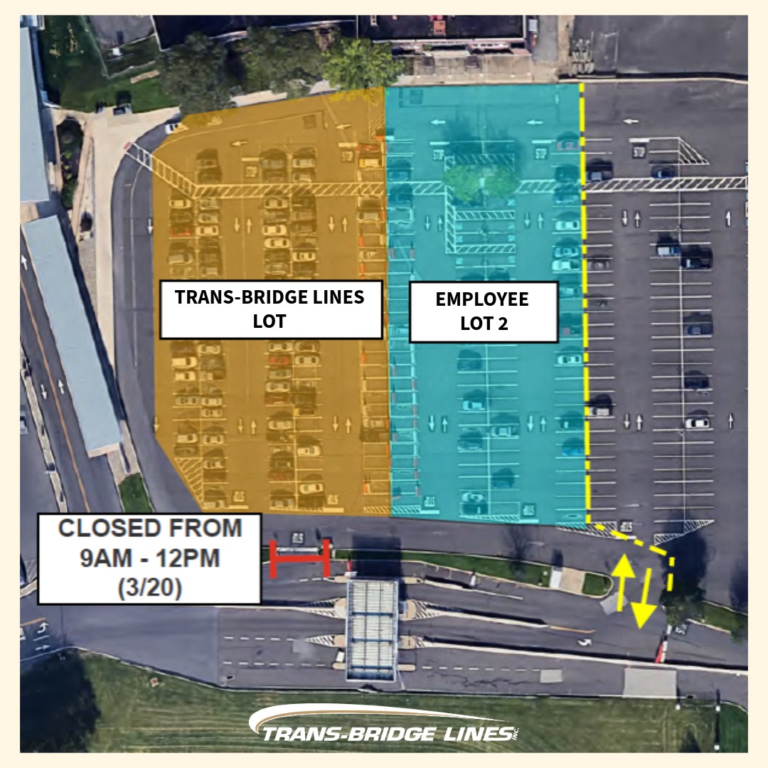 ATTENTION PASSENGERS: Tomorrow, Friday March 20th, the Trans-Bridge Lines parking entrance at the Lehigh Valley International Airport (ABE) will be closed between 9:00 a.m. – 12:00 p.m. to complete road & utility work. Please use the employee entrance to enter and exit the lot