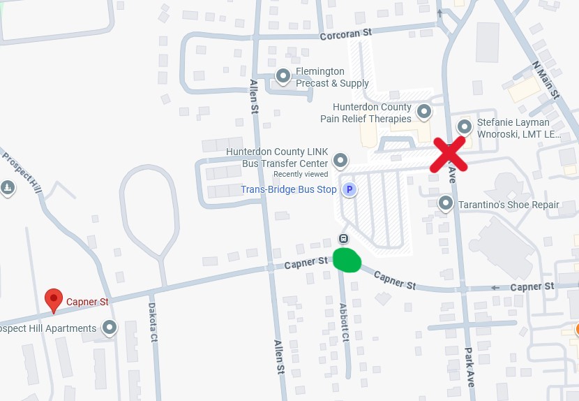 Beginning April 6, 2026, there will be construction at the entrance/exit of our Flemington Lot at 80 Park Ave. Passengers are asked to enter and exit the lot from Capner St. See the map below.