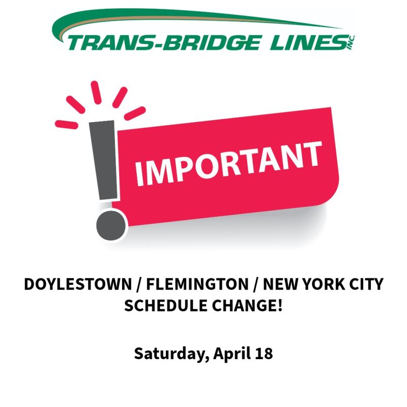 Attention Doylestown/Flemington passengers: Please be advised that this route will not be operating on Saturday, April 18. As a result, Run #301 and Run #308 will be canceled for the day. Please plan accordingly, and we apologize for any inconvenience this may cause.
